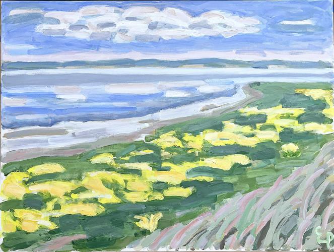 Udsigt over Ho Bugt med blomstrende gyvel.