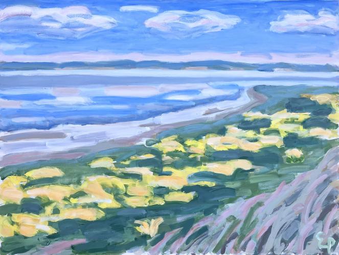 Udsigt over Ho Bugt med blomstrende gyvel.